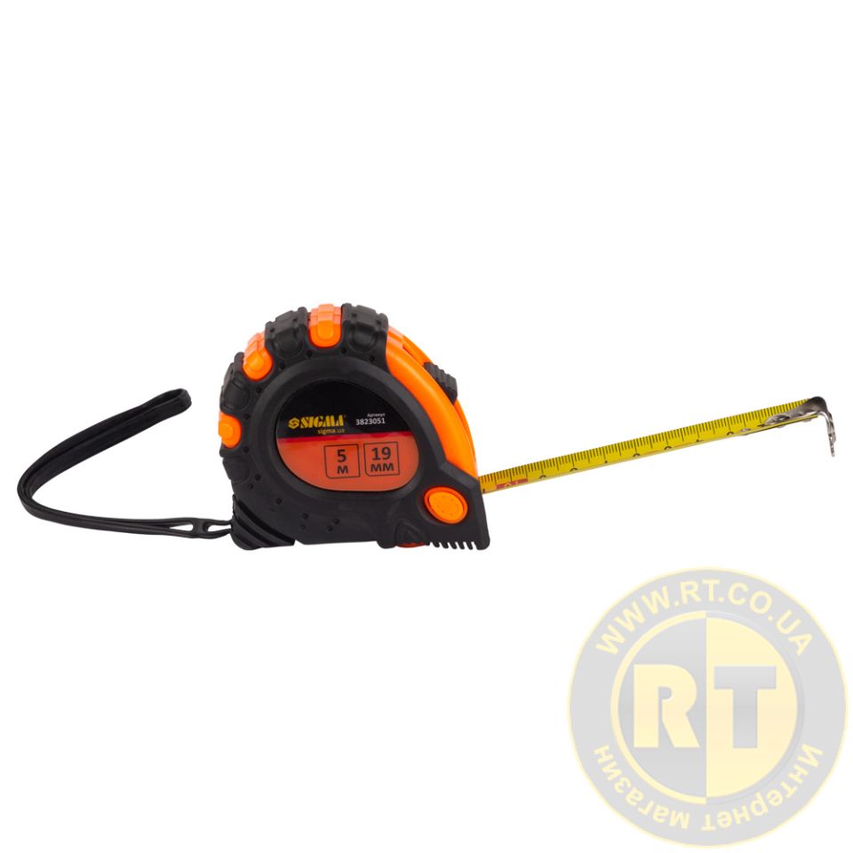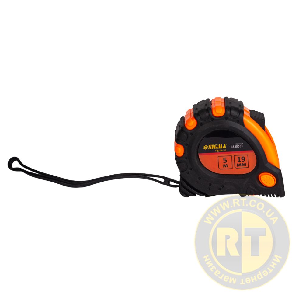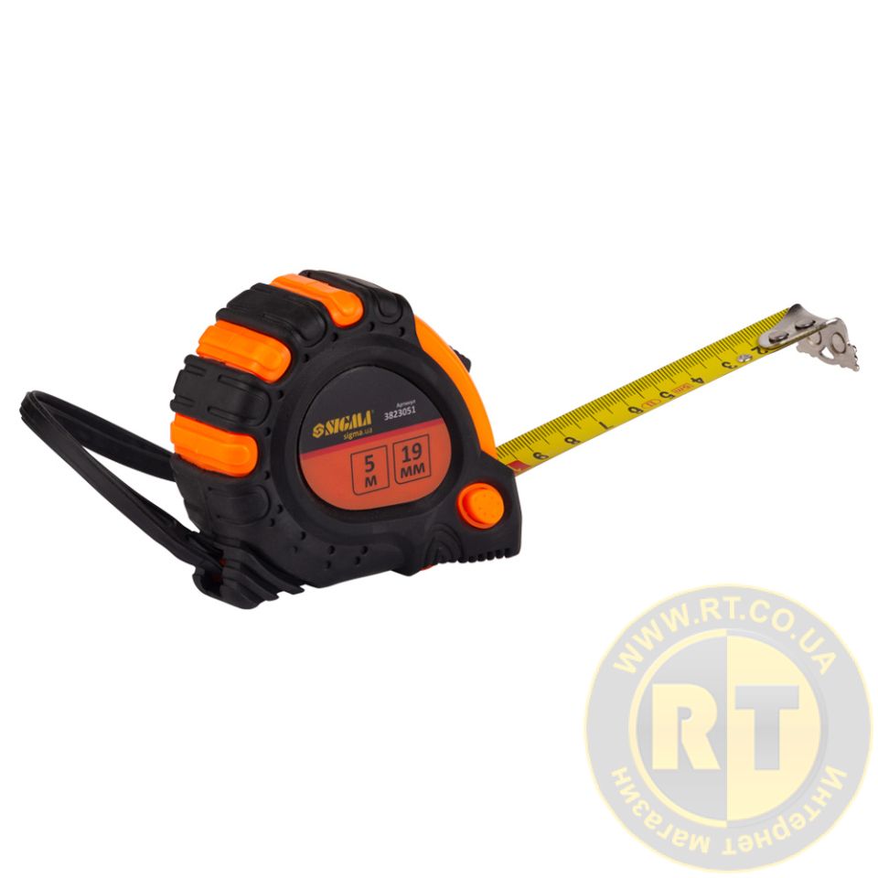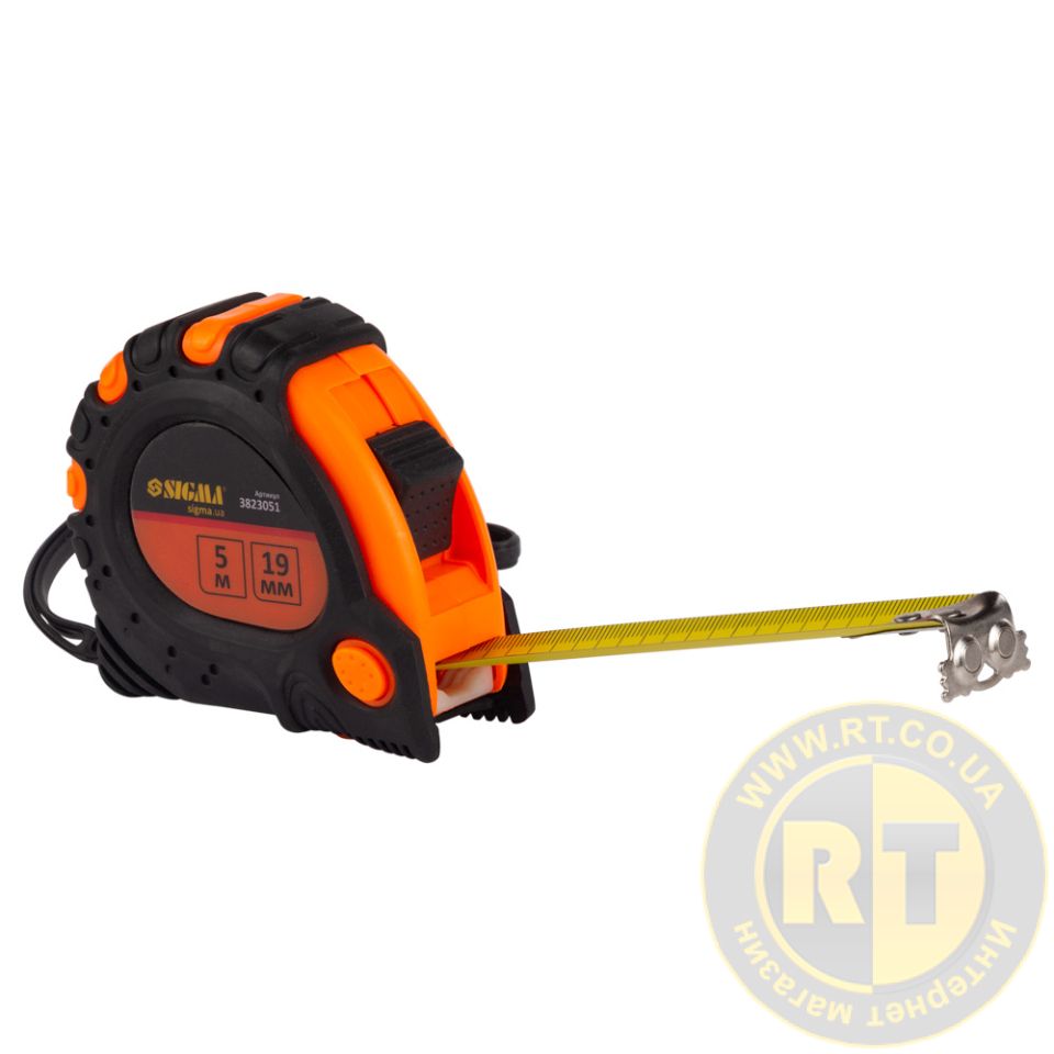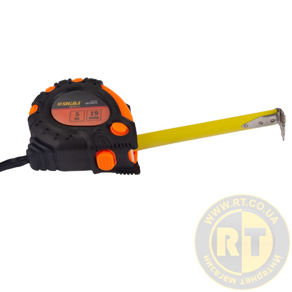 Рулетка магнітна гумова JT фіксатор+гальмо 5м×19мм SIGMA (3823051) функції гальма та блокування виконуються окремими кнопками.