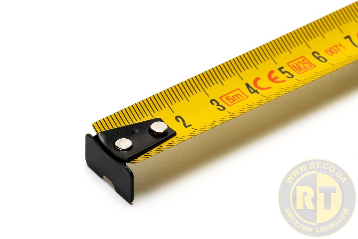 Металева вимірювальна стрічка покрита захисним нейлоновим шаром, який запобігає стиранню шкали, захищає від корозії та продовжує термін служби. Ширина 19 мм забезпечує достатню жорсткість полотна для точного вимірювання навіть на відстані без додаткової підтримки.