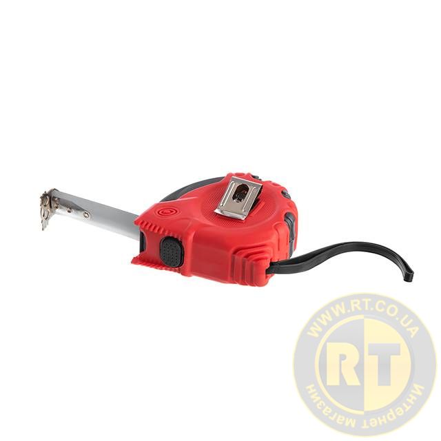 Стрічка вимірювальна виготовлена з міцного металу. Має три фіксатори замикового типу та кнопку зворотного типу.
