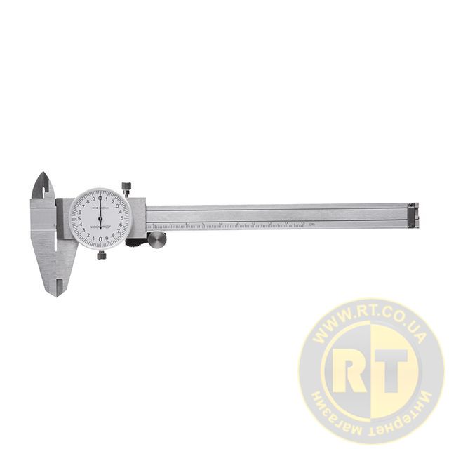 Перевага стрілочного індикатора перед ноніусною шкалою у зручнішому та швидкому зчитуванні показників. Губки з двох сторін забезпечують точні виміри для розмітки внутрішніх та зовнішніх параметрів. Вимірювальна довжина складає 150 мм, довжина щелепи 40 мм. Оснащений коліщатком для підведення пальцем та стопорним гвинтом.