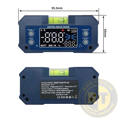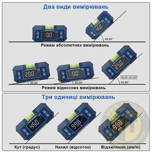 - Переключення одиниць вимірювання та перетворення даних: мм/м, кут/нахил.