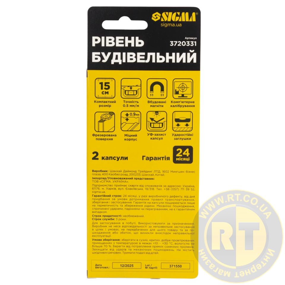 ![]() | Рівень магнітний 2 капсули 15см SIGMA 3720331. Докладніше... | 15 | - | Немає в наявності |