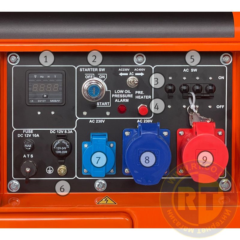 Ергономічно розташована панель управління з цифровим дисплеєм та роз'ємами для підключення до генератора дозволяє повністю контролювати роботу та відображає всі параметри генератора (напруга постійного та змінного струму, вихідна потужність, частота та сила струму, час роботи, індикатор рівня масла).
