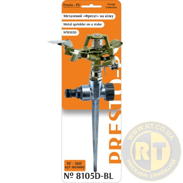 Дощувач імпульсний металевий Presto-PS ( 8105D-BL ) використовується для зрошення газонів середньої та невеликої площі, підійде так само і для міст. На відміну від інших видів ці зрошувачі подають воду короткими импульсами з невеликим годинниковим інтервалом, вбудований маятниковий механізм розбиває струмінь на частини і створює ефект близький до природного дощу. Ця модель досить универсальна, передбачено регулювання сектора поливу від 10 до 360° та висоти подачі води. Максимальний діаметр покриття досягає 25 метрів, площа зрошення до 490 м². До системи водопостачання підключається зрошувач за допомогою фітингів та конекторів. Використовується з гнучкими садовими шлангами 1/2, 5/8 та 3/4 дюйми. Рекомендований робочий тиск у системі від 2 до 4 атмосфер. Витрата води за тиску 2 атмосфери до 0,7 м?/год. Мінімальний тиск, необхідний для роботи зрошувача, становить 0,5 атмосфер. Виготовлений зрошувач з металу, довговічний, стійкий до впливу органічних та неорганічних водорозчинних добрив.