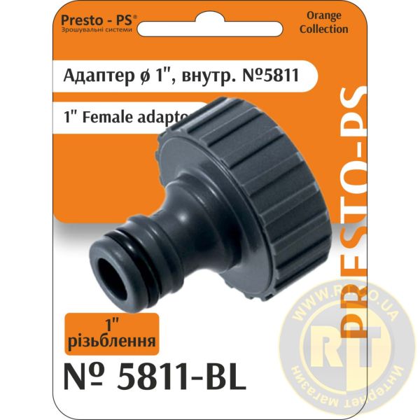Адаптер під конектор Presto-PS (5811-BL) застосовують у комбінації зі швидкознімними конекторами, кранами або трійниками із зовнішнім різьбленням 1 дюйм для під'єднання садових шлангів різних діаметрів до системи водопостачання. Робоче тиск до 4 атмосфер. Виготовляється адаптер з якісного пластику, стійкого до механічних навантажень, дії розчинів добрив та ультрафіолетового випромінювання.