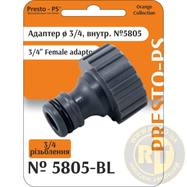 Адаптер під конектор Presto-PS (5805-BL) застосовують у комбінації зі швидкознімними конекторами, кранами або трійниками із зовнішнім різьбленням 3/4 дюйми для під'єднання садових шлангів різних діаметрів до системи водопостачання. Робоче тиск до 4 атмосфер. Виготовляється адаптер з якісного пластику, стійкого до механічних навантажень, дії розчинів добрив та ультрафіолетового випромінювання.