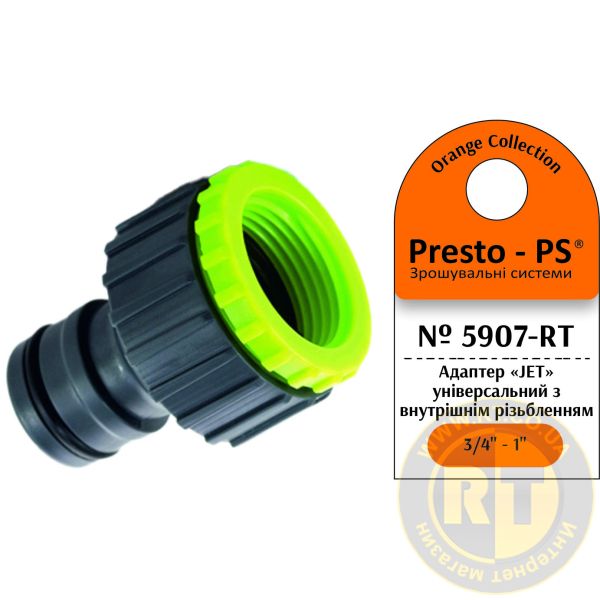 Адаптер під конектор Presto-PS (5907-RT) застосовують у комбінації зі швидкоз'ємними конекторами та кранами або трійниками із зовнішнім різьбленням 3/4 або 1 дюйм для під'єднання садових шлангів різних діаметрів до системи водопостачання. Належить ця модель до серії Jet зі збільшеним внутрішнім діаметром адаптера для збільшення водовиливу. Робоче тиск до 4 атмосфер. Виготовляється адаптер з якісного пластику, стійкого до механічних навантажень, дії розчинів добрив та ультрафіолетового випромінювання.