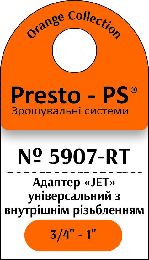 Адаптер під конектор Presto-PS (5907-RT) застосовують у комбінації зі швидкоз'ємними конекторами та кранами або трійниками із зовнішнім різьбленням 3/4 або 1 дюйм для під'єднання садових шлангів різних діаметрів до системи водопостачання. Належить ця модель до серії Jet зі збільшеним внутрішнім діаметром адаптера для збільшення водовиливу. Робоче тиск до 4 атмосфер. Виготовляється адаптер з якісного пластику, стійкого до механічних навантажень, дії розчинів добрив та ультрафіолетового випромінювання.