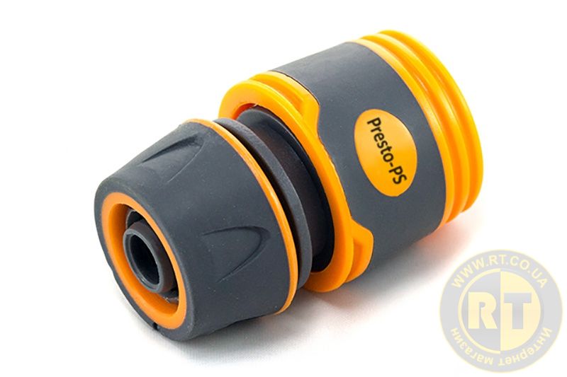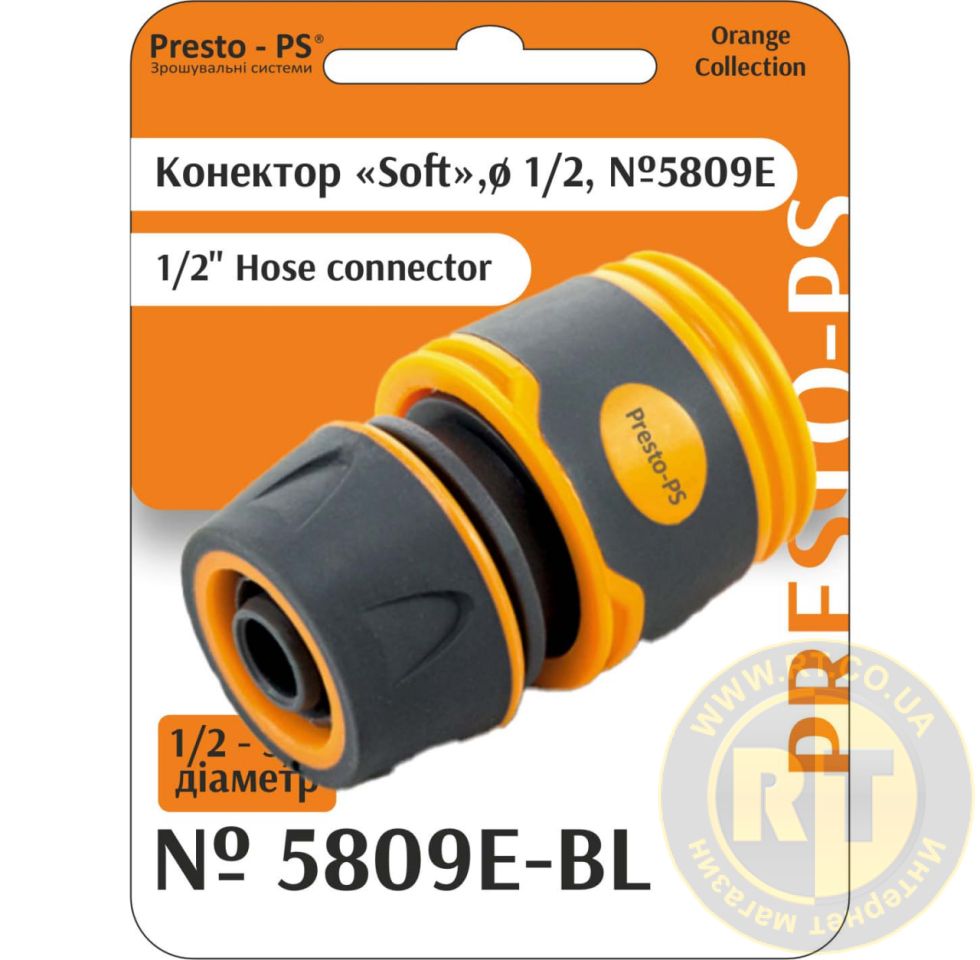 Конектор Presto-PS (5809Е-BL) застосовують разом із різьбовими адаптерами та кранами для під'єднання садових шлангів діаметром 1/2 та 5/8 дюйма до системи водопостачання, для з'єднання шлага зі зрошувальними пістолетами та дощовиками, для з'єднання шлангів між собою за допомогою прохід. Для зручності використання ззовні конектор покритий гумовою кулею Soft-Touch. Робоче тиск до 4 атмосфер. Виготовляється конектор з якісного пластику стійкого до механічних навантажень, дії добрив, ультрафіолетового випромінювання.