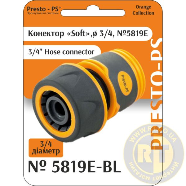 Конектор Presto-PS (5819E-BL) застосовують разом із різьбовими адаптерами та кранами для під'єднання садових шлангів діаметром 3/4 дюйма до системи водопостачання, для з'єднання шлага зі зрошувальними пістолетами та дощовиками, для з'єднання шлангів між собою за допомогою прохідного адаптера. Для зручності використання ззовні конектор покритий гумовою кулею Soft-Touch. Робоче тиск до 4 атмосфер. Виготовляється конектор з якісного пластику стійкого до механічних навантажень, дії добрив, ультрафіолетового випромінювання.