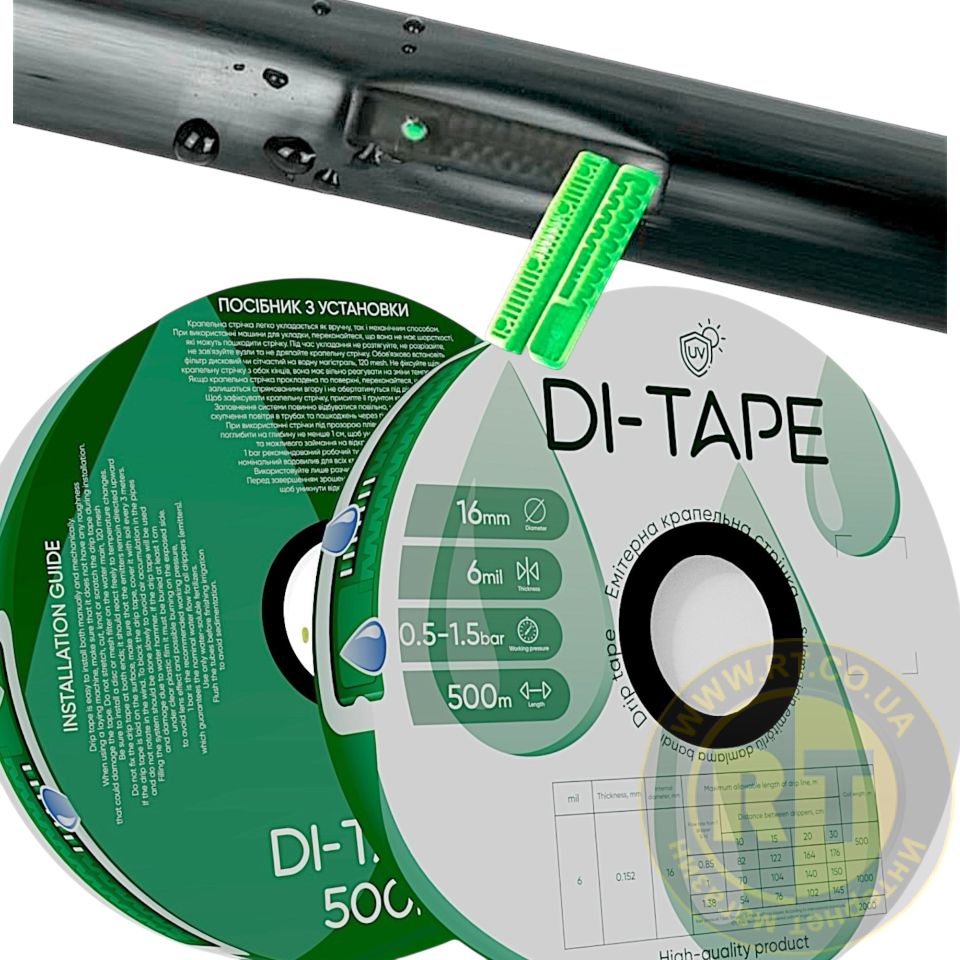 Крапельна стрічка Di-Tape (DI-15-200) це гнучка трубка з товщиною стінки 0.15 мм (6 mil) та вбудованими крапельницями (емітерами), які розташовуються через кожні 10 см, забезпечуючи максимально сприятливі умови для вирощуваних культур. Стрічка крапельного поливу має тривалий термін служби, завдяки вбудованим крапельницям стійка до засмічення та забезпечує більш точне та більш стабільне зрошення. Для запобігання забрудненню шкірна крапельниця має свій вбудований фільтр із лабіринтом у формі зубчастого каналу. Крапельниці вбудовані в стінку стрічки за допомогою екструзії і чинять мінімальний опір водяному потоку. Підвійна система захисту забезпечує максимальну надійність роботи крапельниць, за рахунок цього досягається точне, стабільне зрошення та висока однорідність поливу по всій довжині.