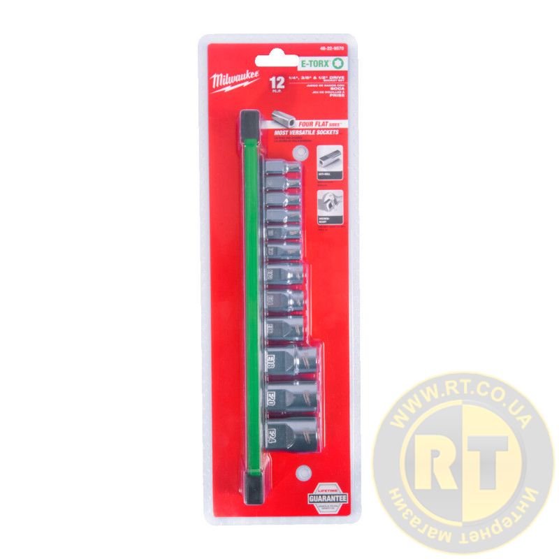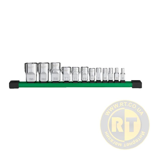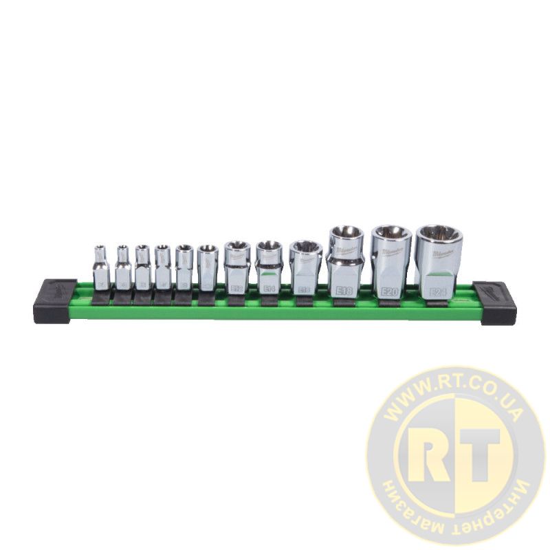Набір головок торцевих хромованих ¼”, ⅜″, ½” TORX Е-стандарт MILWAUKEE, на планці (13шт)