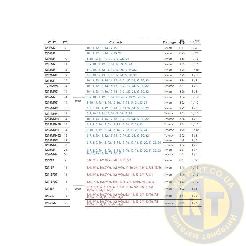 Ключі комбіновані, серії 1060 (розмір х довжина): 5/16" х 125 мм, 3/8" 145 мм, 7/16" х 155 мм, 1/2" х 175 мм, 9/16" х 185 мм, 5/8 х 20 3/4" х 235 мм, 13/16" х 255 мм, 7/8" х 265 мм, 15/16" х 285 мм, 1" х 295 мм, 1-1/8" х 315 мм, 1-1/4" х 365 мм
