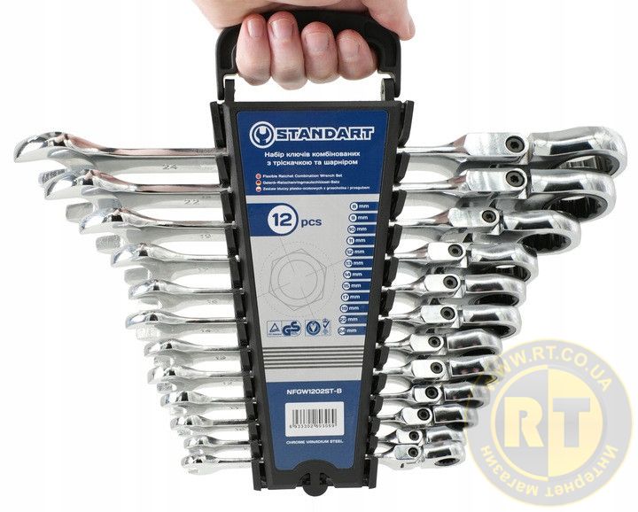 Професійний набір з 12 ріжково-накидних ключів бренду STANDART, оснащених тріскачкою та рухомим накидним шарніром, що дозволяє працювати під різними кутами. Відмінний вибір як для професіоналів, так і для домашніх майстрів, яким потрібні зручні та функціональні інструменти.