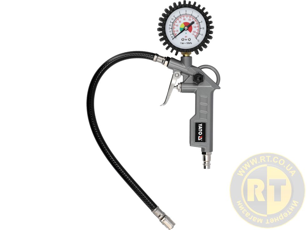 - Пістолет для накачування шин з кнопкою та ПВХ шлангом 370 мм дозволяє швидко та зручно накачувати шини, м'ячі чи матраци.