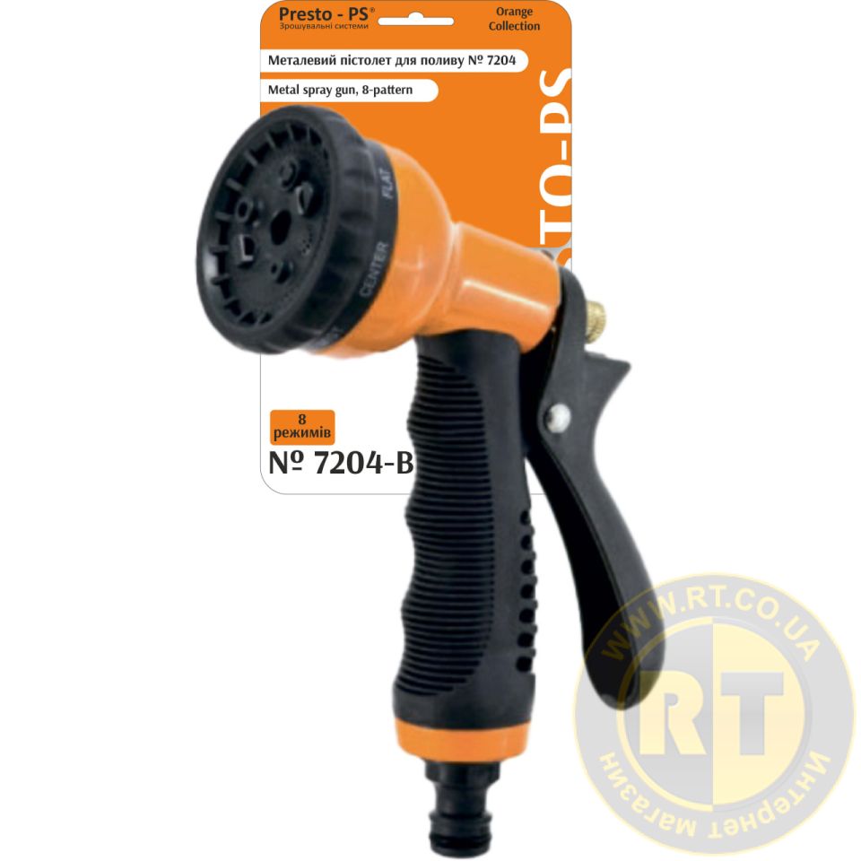 Пістолет для поливу Presto-PS (7204-BL)  використовується для ручного поливу газонів середньої та невеликої площі, міст, квітників, прибирання доріжок на прибудинковій території, миття садового інвентарю та техніки. Поворотна головка пістолета має 8 положень і регулює форму струменя та ступінь розпилення води. Можливі режими роботи: м'який струмінь, дрібний струмінь, кутовий, дощ, душ, туман, плоский горизонтальний, конус. Підключається до садових шлангів діаметром 1/2, 5/8 та 3/4 дюйма за допомогою стандартних конекторів. Рекомендований робочий тиск у системі від 2 до 4 атмосфер. Виготовлений поливальний пістолет з металу, довговічний, стійкий до механічних пошкоджень, впливу ультрафіолету та водорозчинних удобрень.
