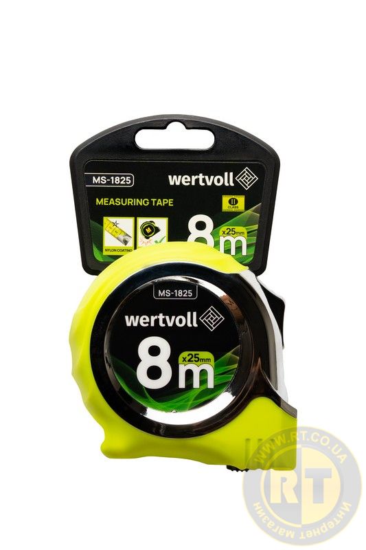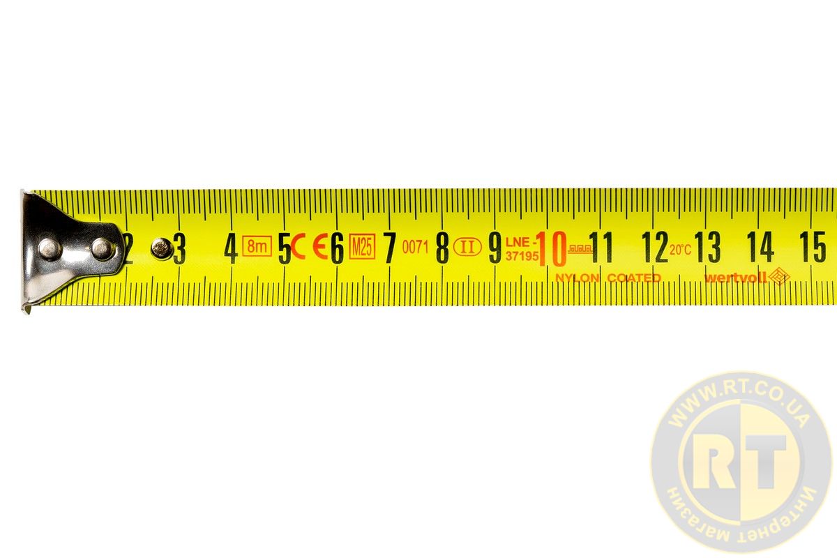 Рулетка 8 м × 25 мм – оптимальний вибір для майстрів та будівельників, яким потрібна надійність, довговічність та максимальна точність. • довжина 8 м, ширина стрічки 25 мм — підходить для масштабних вимірювань