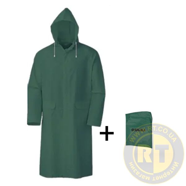Матеріал плаща - полівінілхлорид (PVC), завдяки чому він легкий, міцний та стійкий до зношування. Плащ легко очищається від бруду. Надійні поліпропіленові кнопки забезпечують щільну застібку. Капюшон оснащений регульованими шнурками, що гарантує зручну посадку та захист від дощу та вітру. Має дві місткі кишені з клапанами, які захистять ваші речі від намокання.