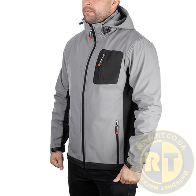 Куртка SOFTSHELL світло-сіро/чорна, з капюшоном, тришарова, стрейч 300 GSM 100D, водо-/вітрозахист, 96% поліестер / 4% еластан, 3 кишені, M INTERTOOL SP-3122