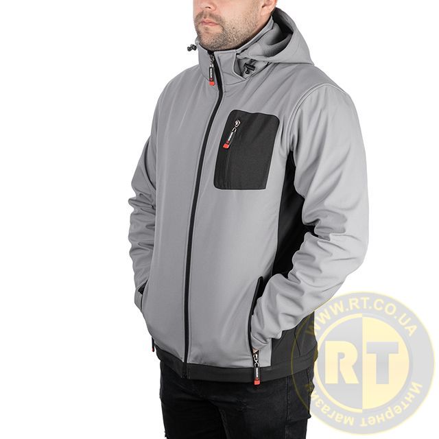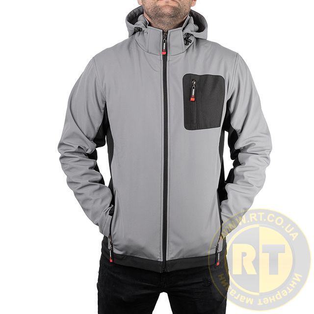 Куртка SOFTSHELL світло-сіро/чорна, з капюшоном, тришарова, стрейч 300 GSM 100D, водо-/вітрозахист, 96% поліестер / 4% еластан, 3 кишені, S INTERTOOL SP-3121