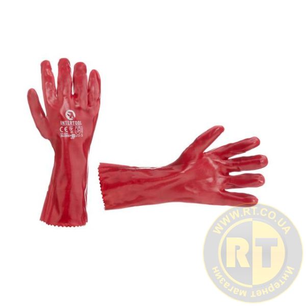 Рукавиці повністю покриті червоним PVC (полівінілхлоридом) для стійкого захисту рук від забруднень і рідких речовин, а також механічних пошкоджень. Довжина рукава 350 мм дозволяє забезпечити захист рук до середини передпліччя. При цьому рукавиці досить гнучкі. Стійкі до стирання і мають тривалий строк експлуатації.