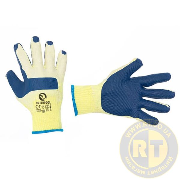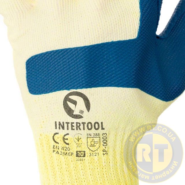 Рукавичка трикотажна, полікотон, скляра (муляра), подвійне латексне покриття, синя долоня, захист суглобів, 10" INTERTOOL SP-0003