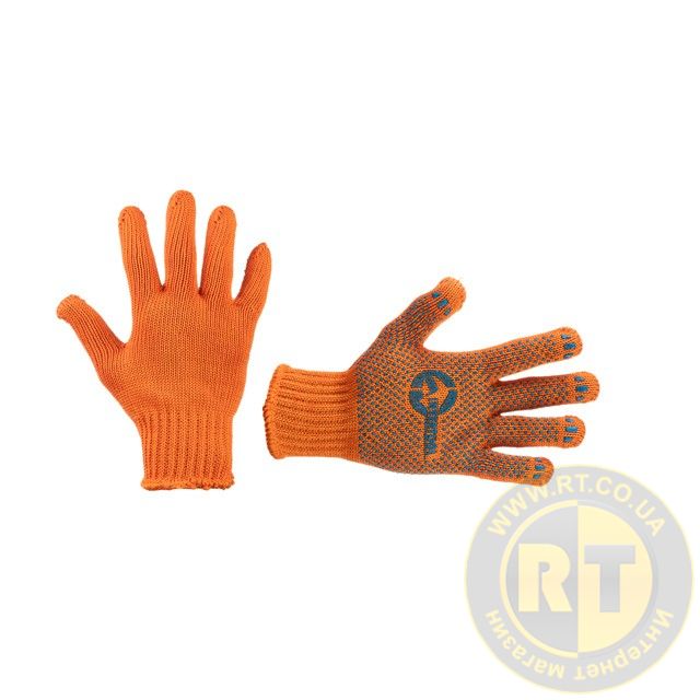 Рукавичка трикотажна з платіровкою, сині ПВХ крапки, 60% бавовна / 40% поліестер, 10", клас в’язки 7, помаранчева, 90 г INTERTOOL SP-0135