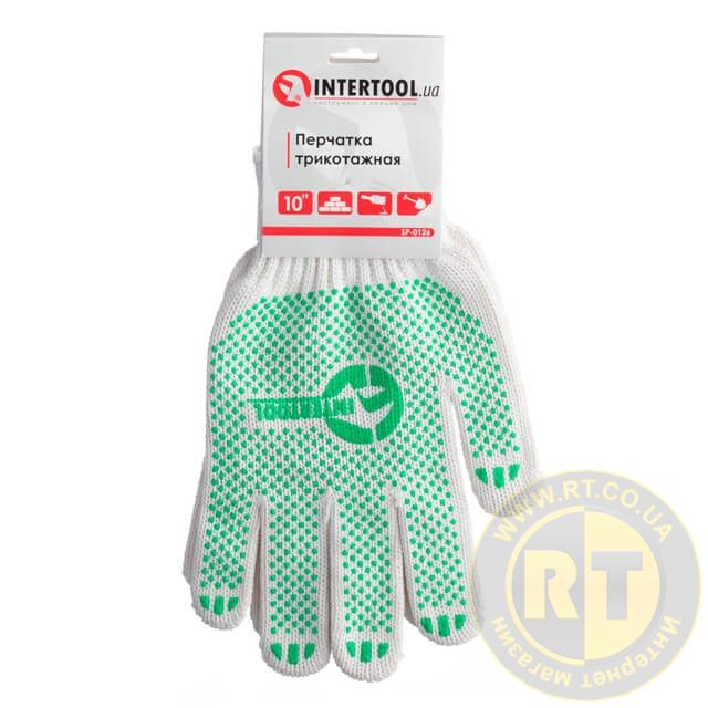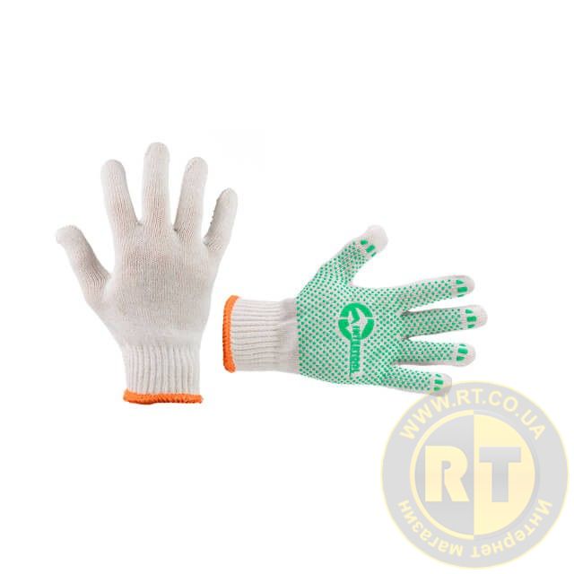 Рукавичка трикотажна з платіровкою, зелені ПВХ крапки, 60% бавовна / 40% поліестер, 10", клас в’язки 7, біла, 90 г INTERTOOL SP-0126
