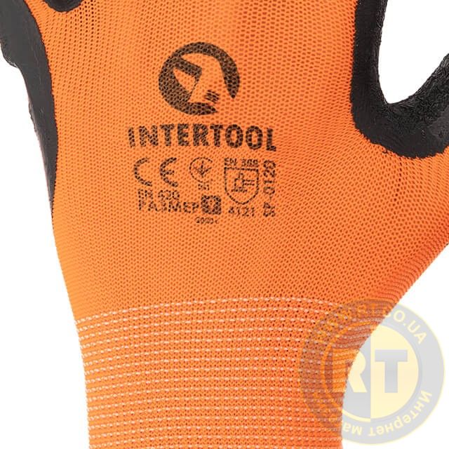 Рукавичка трикотажна з покриттям з чорного спіненого латексу, синтетична, помаранчева, 9" INTERTOOL SP-0120