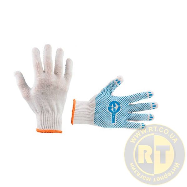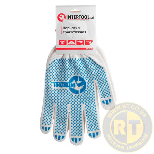 Рукавичка трикотажна, сині ПВХ крапки, 70% бавовна / 30% поліестер, 10", клас в’язки 10, біла, 52 г INTERTOOL SP-0130