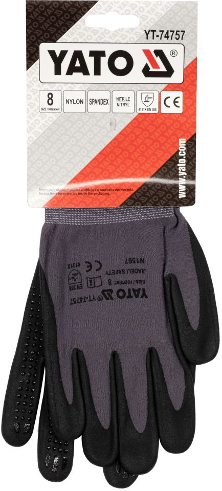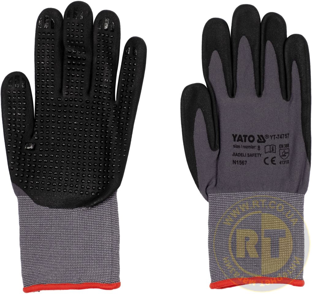 Рукавички робочі нейлонові покриті спіненим нітрилом з накріпленням, розмір 8, чорно-сірі. Yato YT-74757