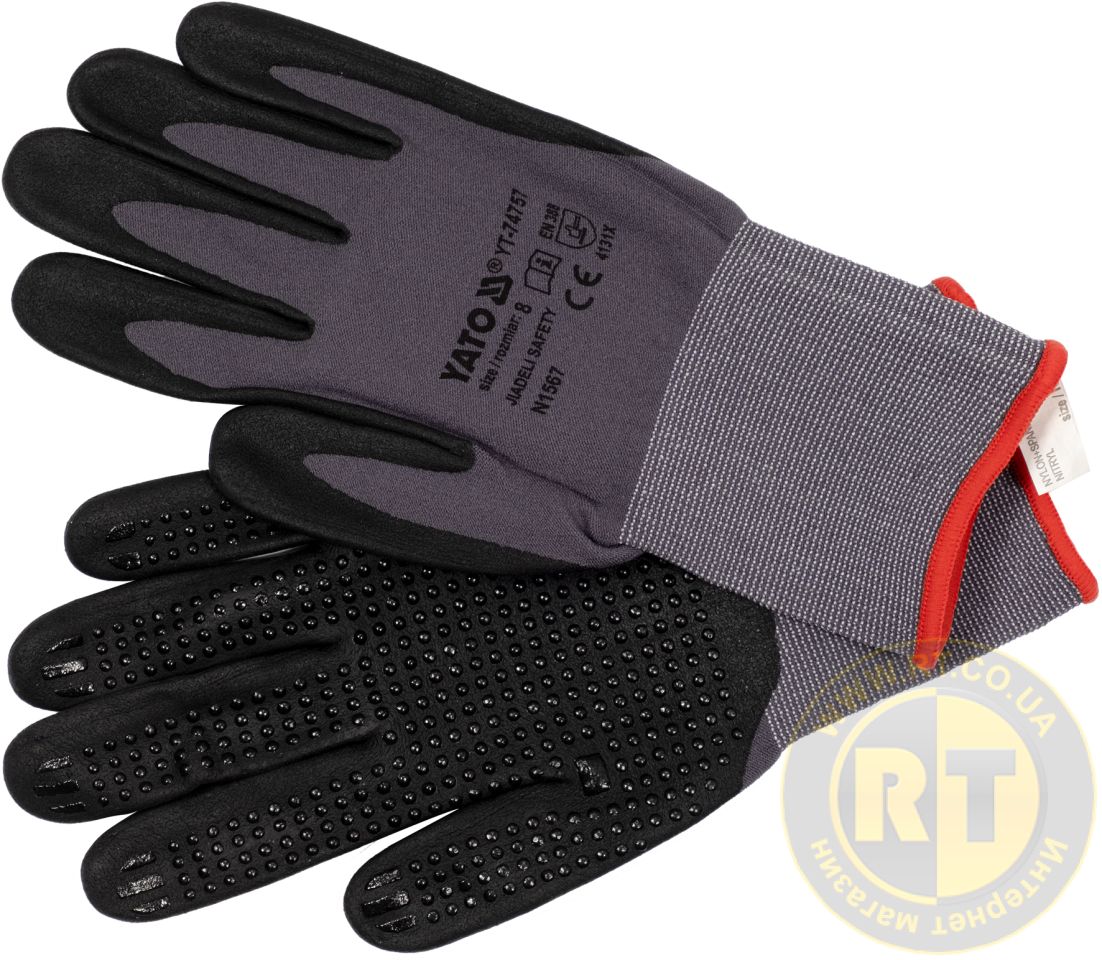 Рукавички робочі нейлонові YATO покриті спіненим нітрилом з накріпленням, розмір 8, чорно-сірі.