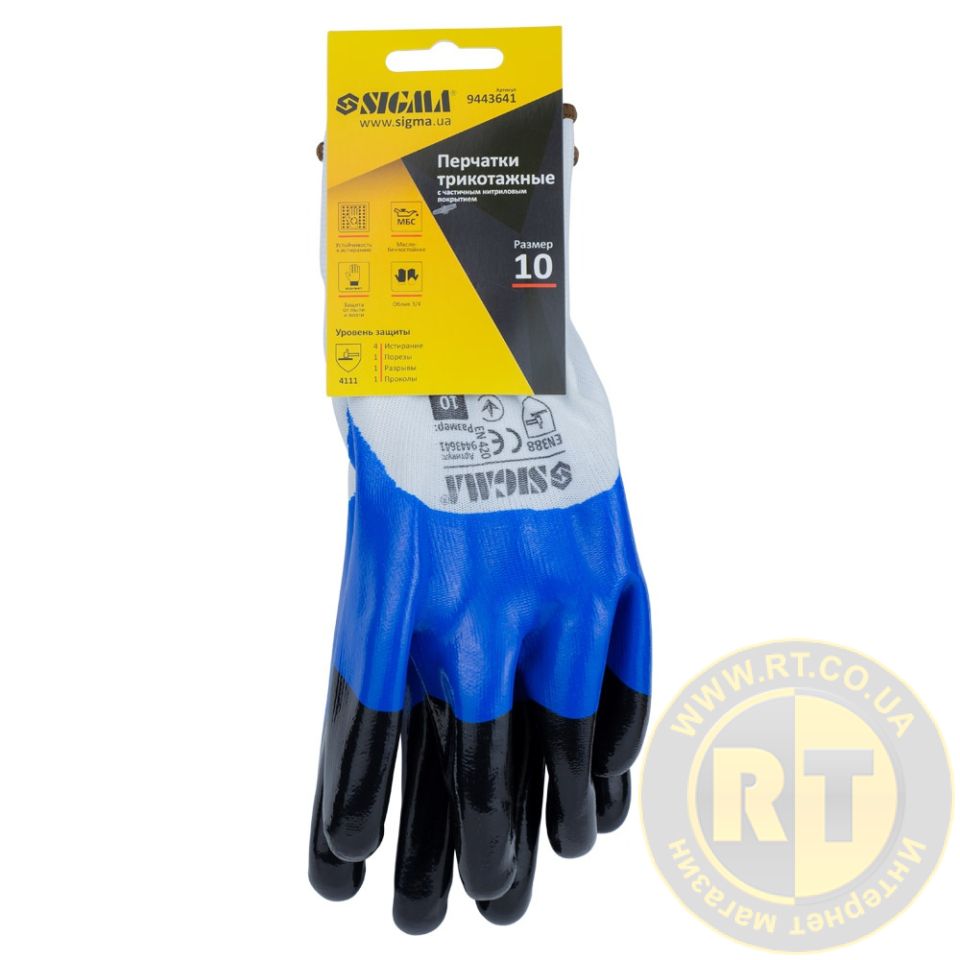 Рукавички трикотажні з частковим нітриловим покриттям посилені пальці р10 (синьо-чорні, манжет) SIGMA (9443641) призначені для захисту від механічних впливів, жиру та олії.