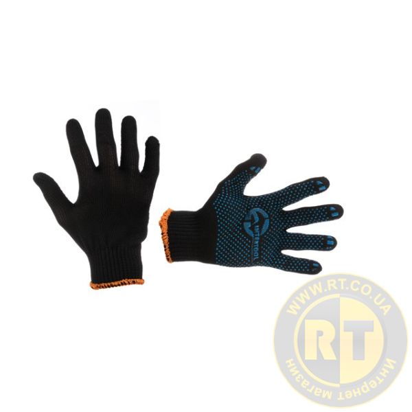 Рукавичка садова трикотажна з синіми ПВХ крапками, 100% поліестер, 10", клас в'язки 10, чорна, 55 г INTERTOOL SP-0104