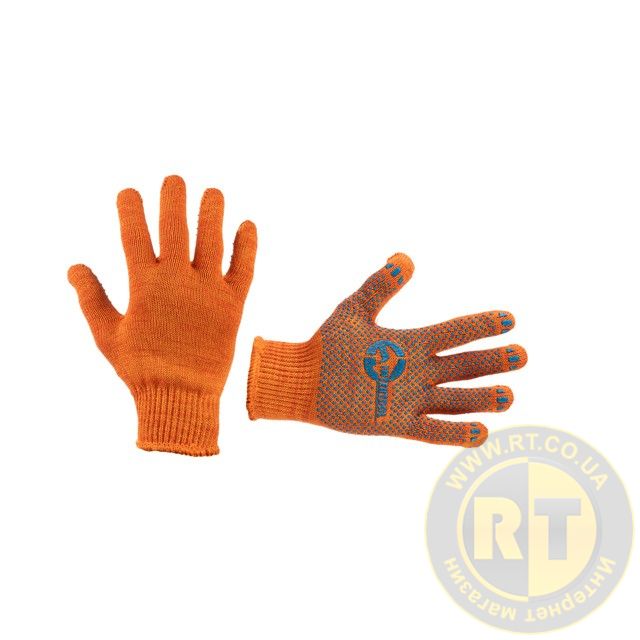 Рукавичка трикотажна, сині ПВХ крапки, 70% бавовна / 30% поліестер, 10", клас в’язки 10, помаранчева, 50 г INTERTOOL SP-0131