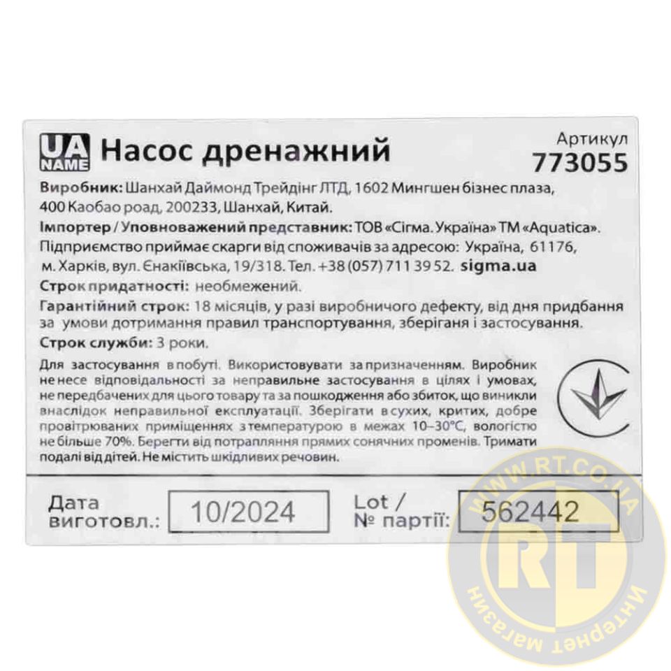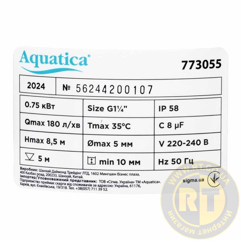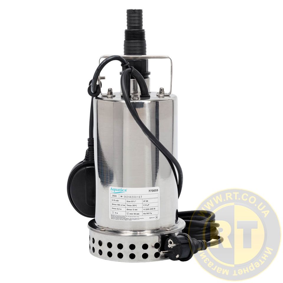 Насос дренажний садовий 0.75кВт Hmax 8м Qmax 180л/хв (част. до 5мм, нерж) AQUATICA (773055)