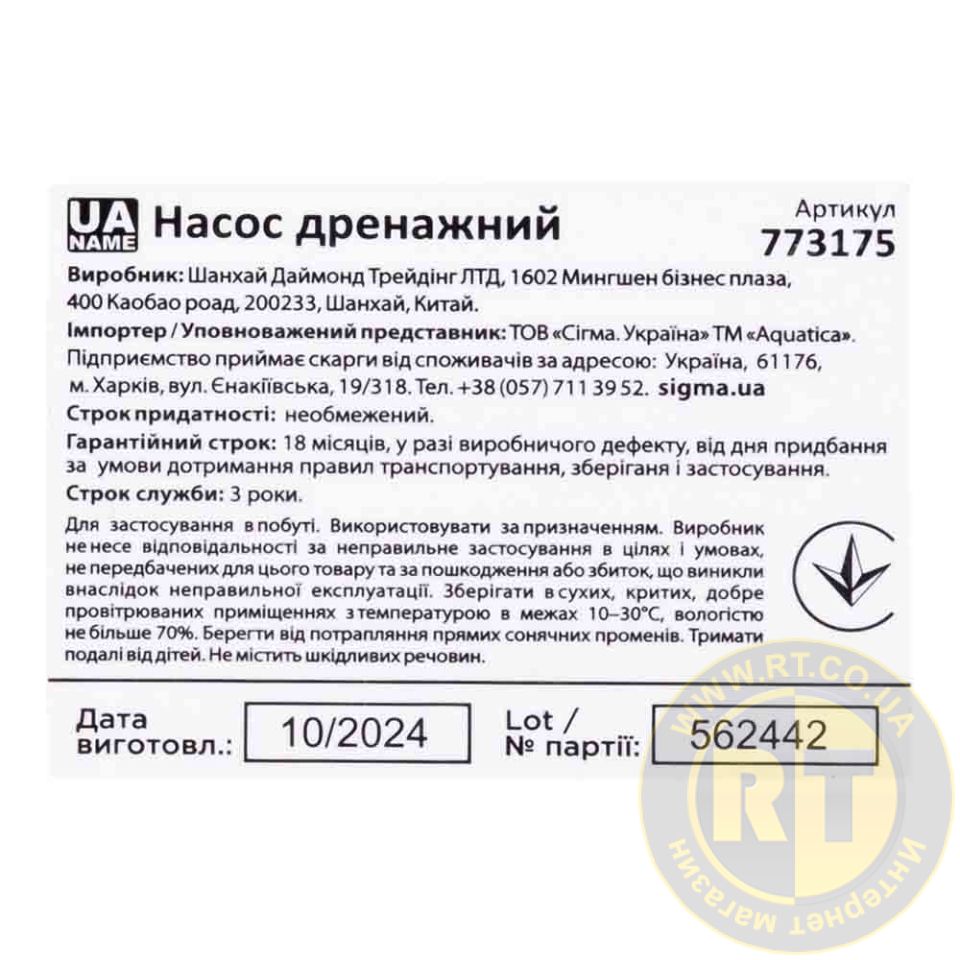Насос дренажний садовий 0.75кВт Hmax 9.5м Qmax 220л/хв (част. до 30мм) AQUATICA (773175)