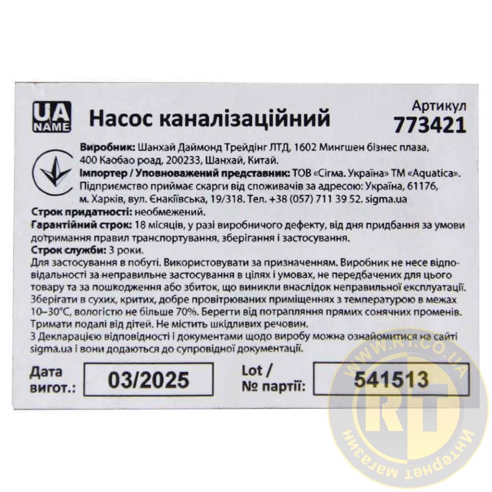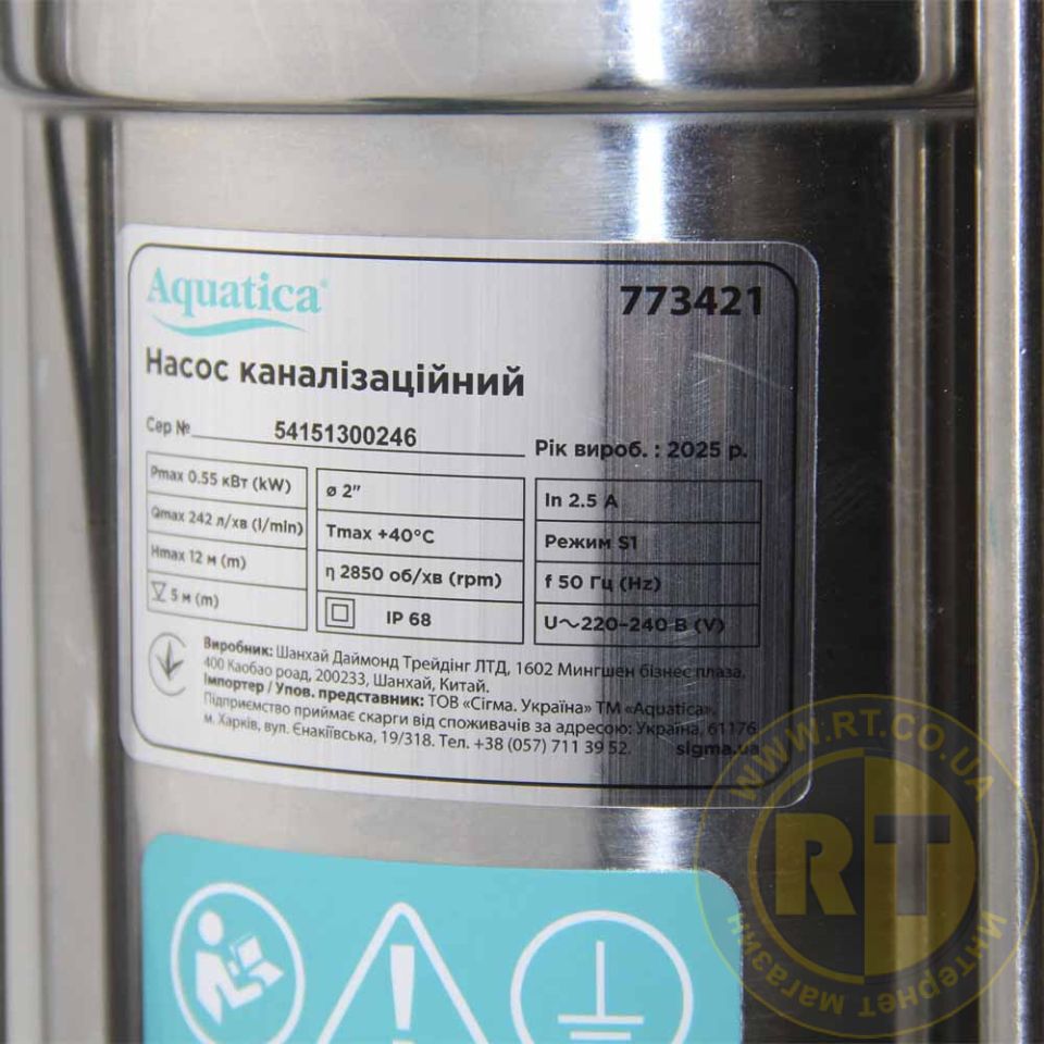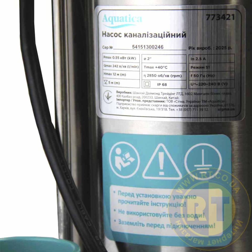 Насос каналізаційний 0.55кВт Hmax 12м Qmax 242л/хв (нерж) AQUATICA 773421