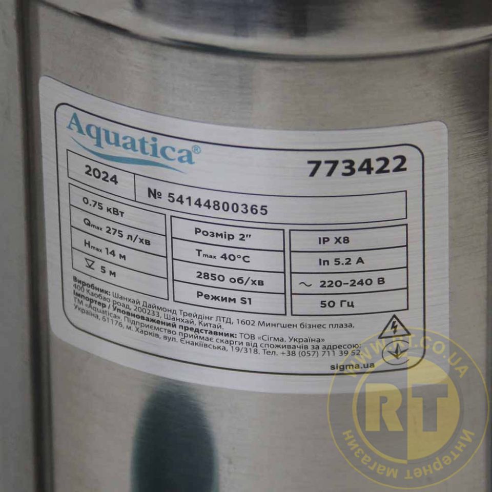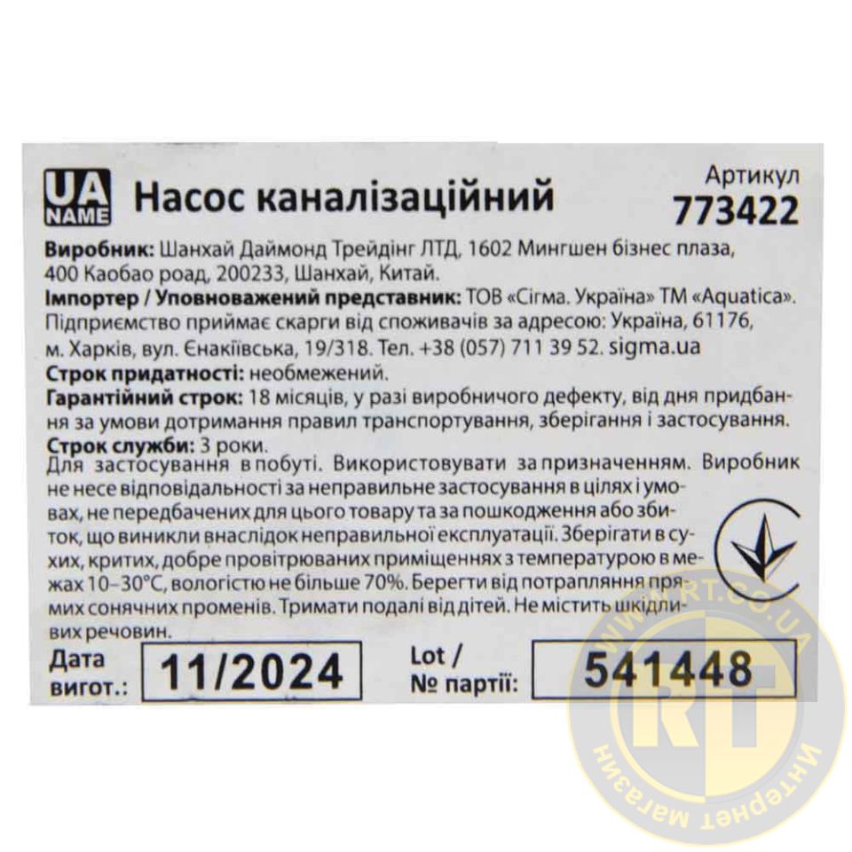 Насос каналізаційний 0.75кВт Hmax 14м Qmax 275л/хв (нерж) AQUATICA 773422