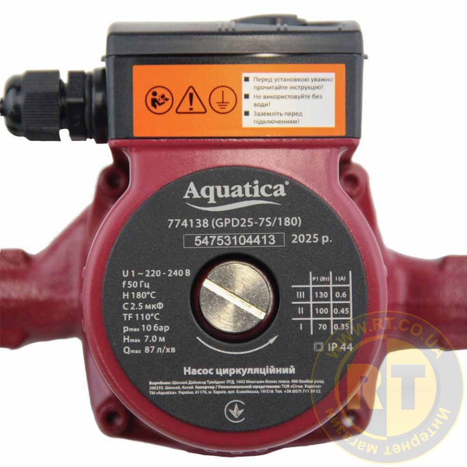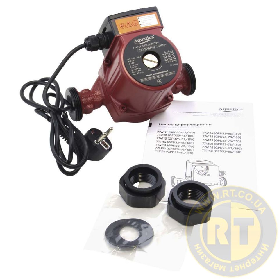 Насос циркуляційний 130Вт Hmax 7м Qmax 87л/хв Ø1½" 180мм + гайки Ø1" AQUATICA (774138)
