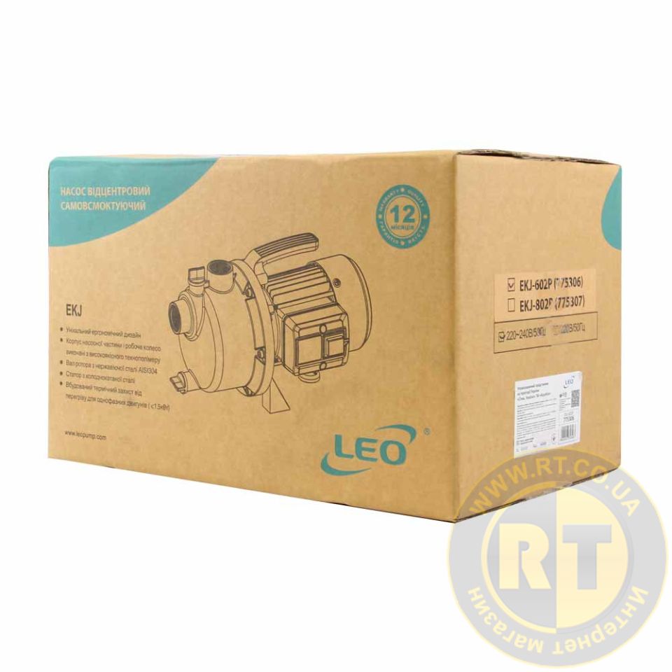 Насос відцентровий самовсмоктуючий 0.6кВт Hmax 35м Qmax 50л/хв пластик LEO EKJ-602P (775306)
