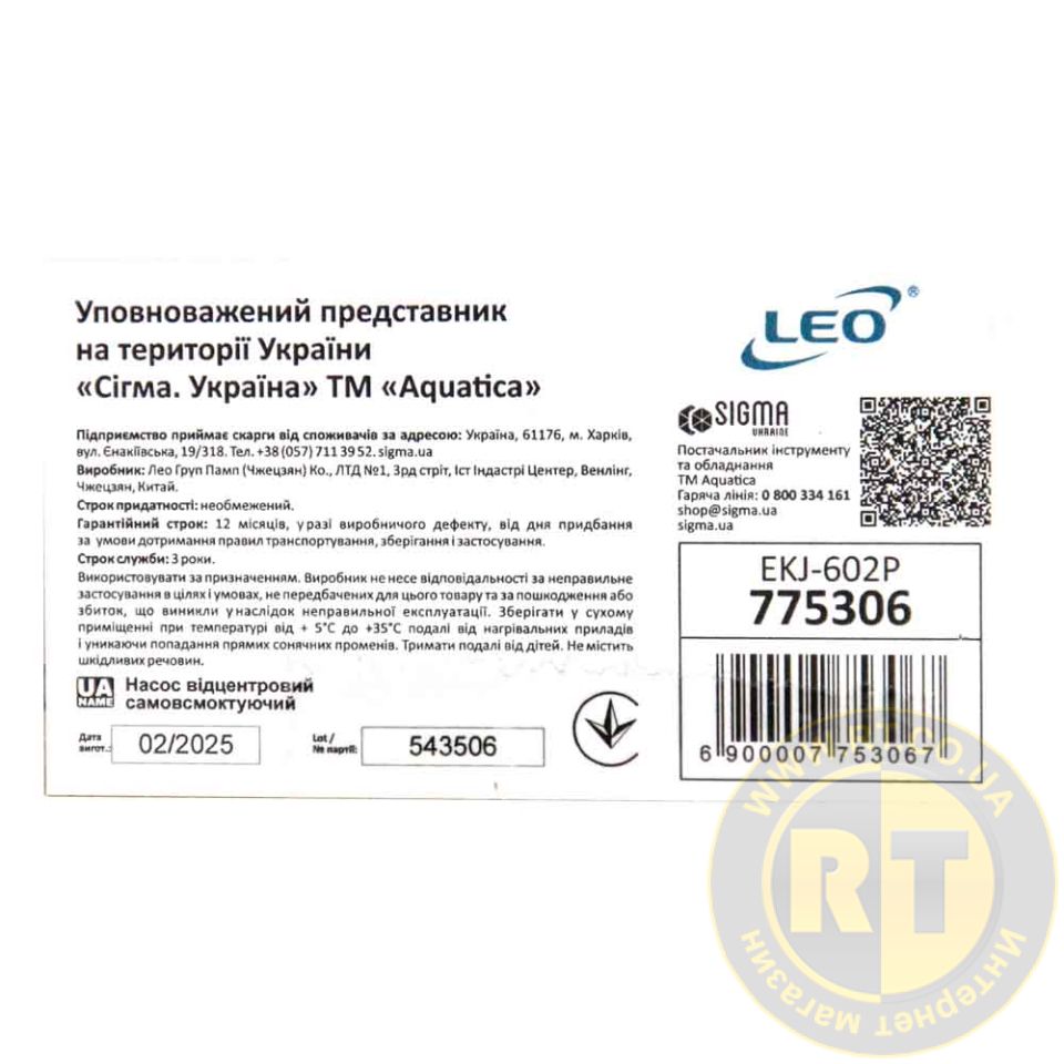 Насос відцентровий самовсмоктуючий 0.6кВт Hmax 35м Qmax 50л/хв пластик LEO EKJ-602P 775306