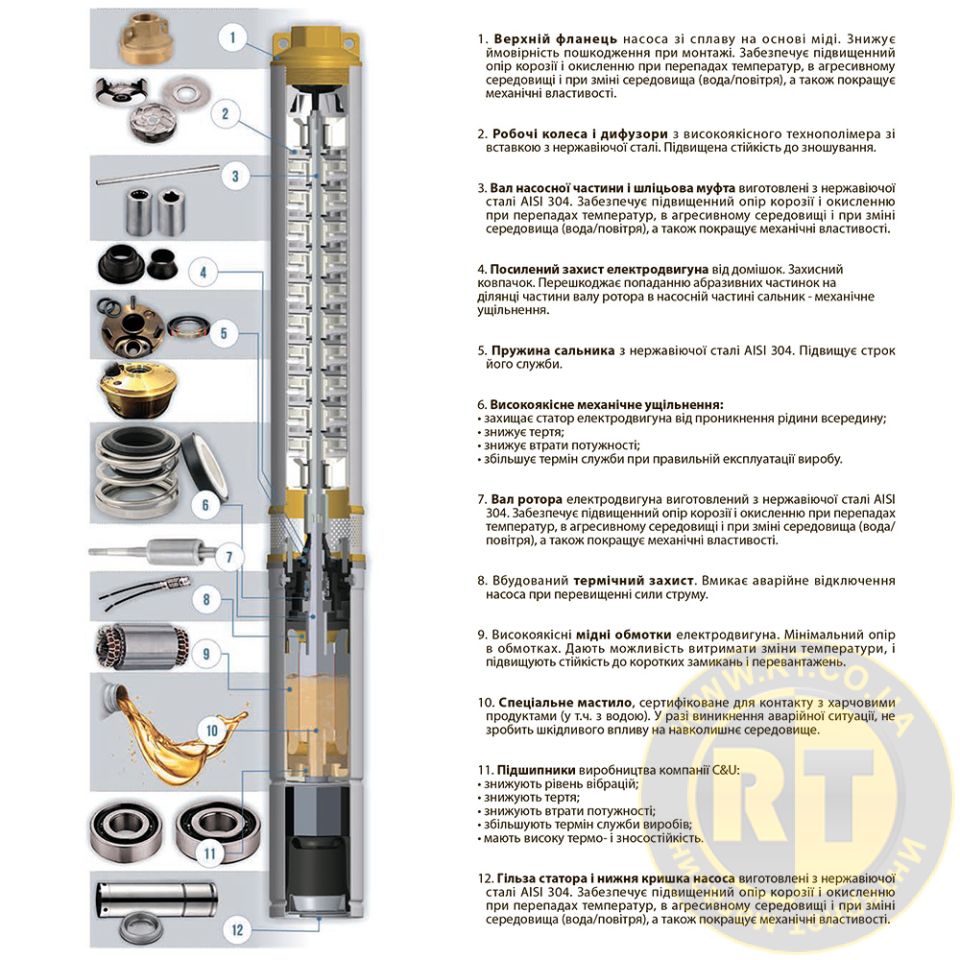 - Тип двигуна: асинхронний, маслонаповнений, з вбудованим в обмотку термозахистом