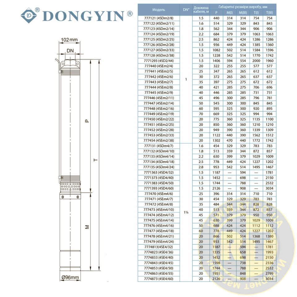 Насос відцентровий свердловинний 1.1кВт H 134(109)м Q 55(30)л/хв Ø105мм 70м кабелю 4SEm2/19 DONGYIN 777449