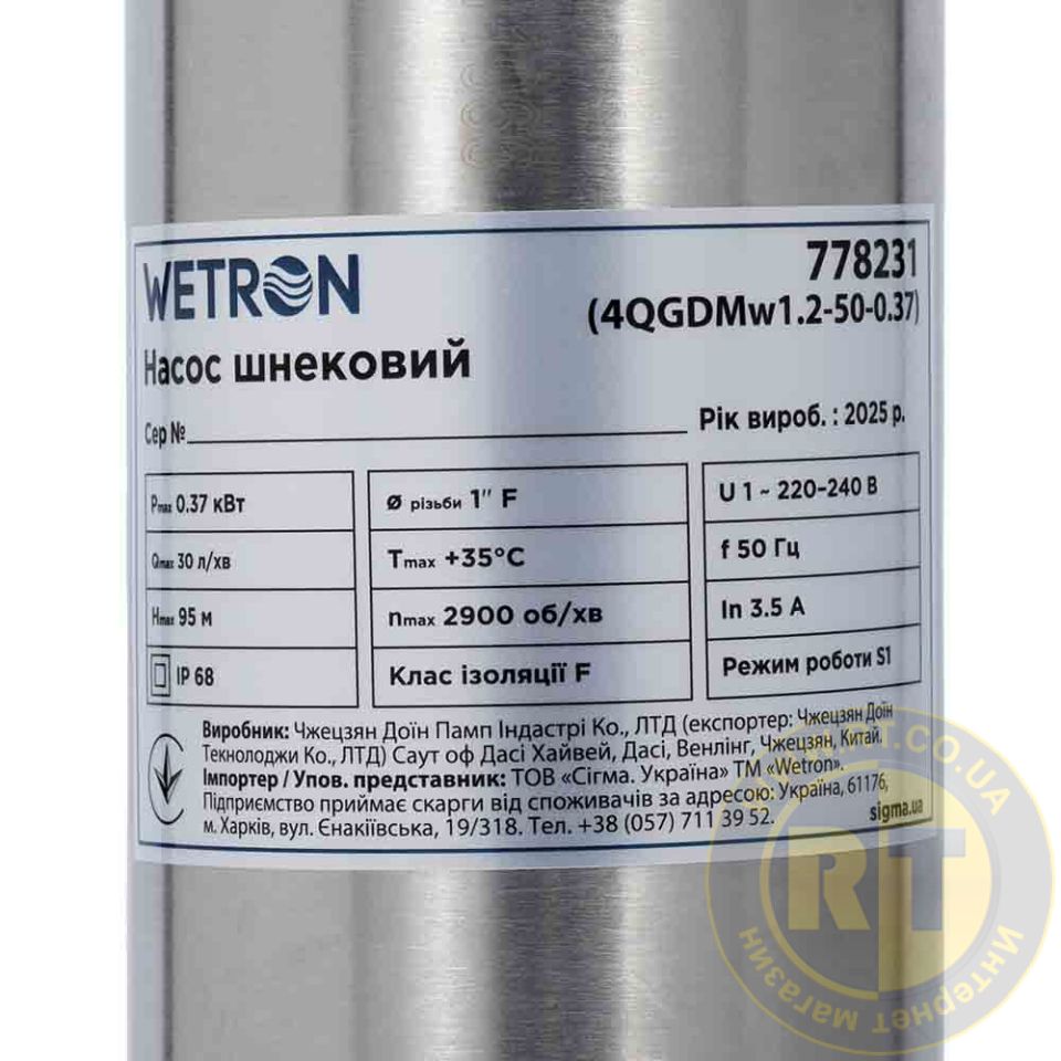 Насос шнековий 0.37кВт H 95(48)м Q 30(20)л/хв Ø96мм 10м кабелю WETRON 4QGDMw1.2-50-0.37 778231
