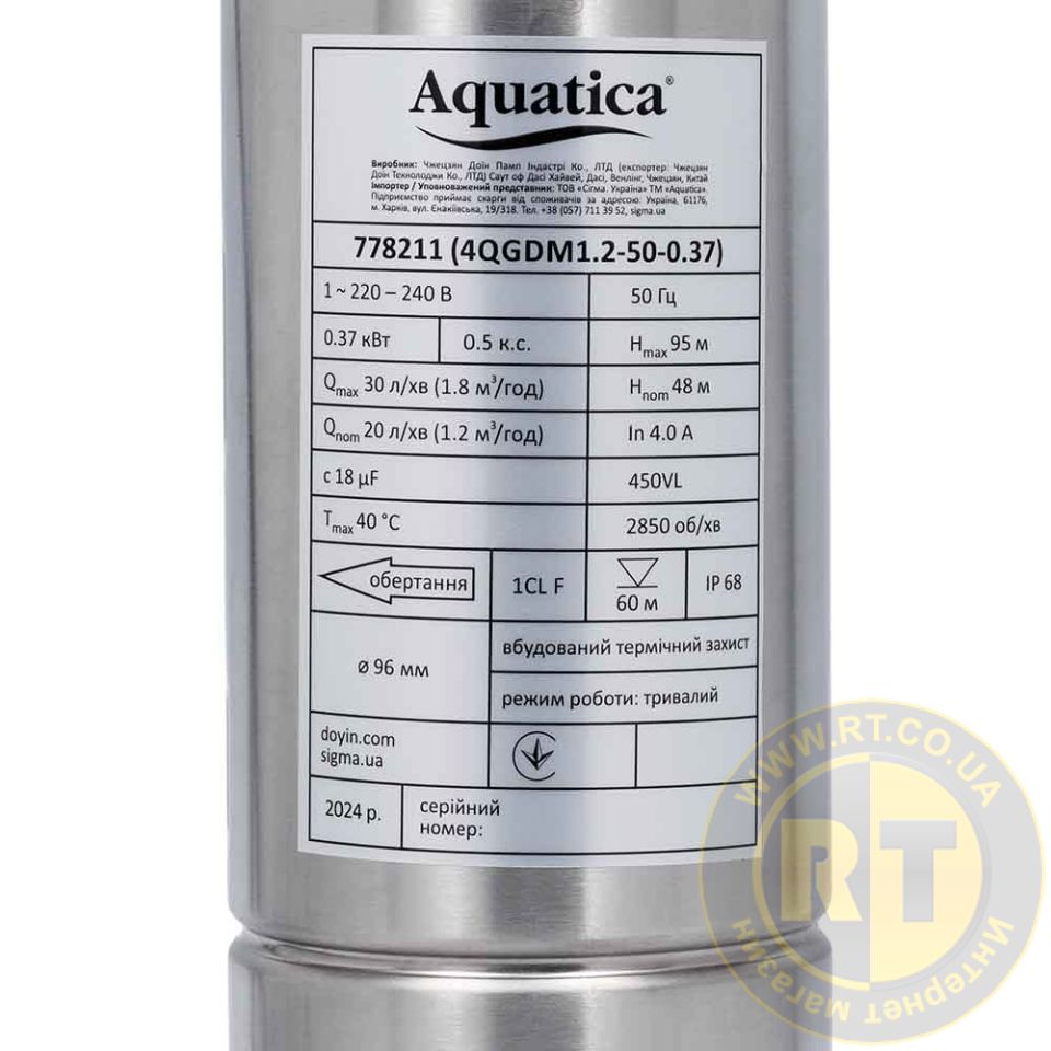 Насос шнековий 0.5кВт H 107(34)м Q 40(30)л/хв Ø96мм 10м кабелю AQUATICA 4QGDM1.8-50-0.5 778212
