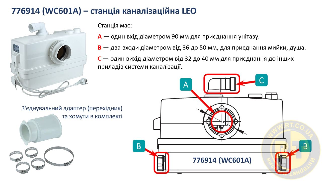 Станція каналізаційна 0.6кВт Hmax 8.5м Qmax 110л/хв 3 входи + фронтальний вхід 90мм LEO 3.0 WC601A 776914