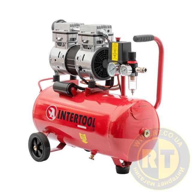 Компресор, 24 л, 0,75 кВт, 220 В, 8 атм, 145 л/хв, 1400 об/хв, малошумний, безмасляний, 2 циліндри INTERTOOL PT-0022