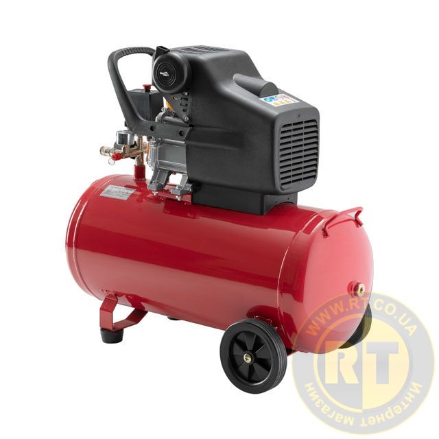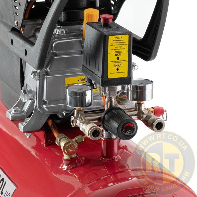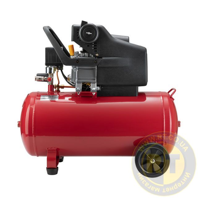 Зручне транспортування компресора по робочому майданчику здійснюється на двох колесах та за допомогою ручки. Опорні ніжки компресора виготовлені з гуми, вона згладжує вібрацію та виступає в ролі амортизаційного елемента. Для того, щоб можна було контролювати тиск у ресивері й тиск на виході, компресор оснащений двома манометрами з регулятором вихідного тиску. Регулятор тиску з манометром дозволяє регулювати та постійно підтримувати вихідний тиск, необхідний вашому інструменту або обладнанню.