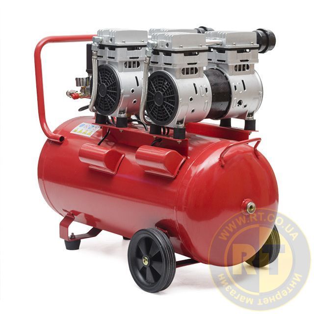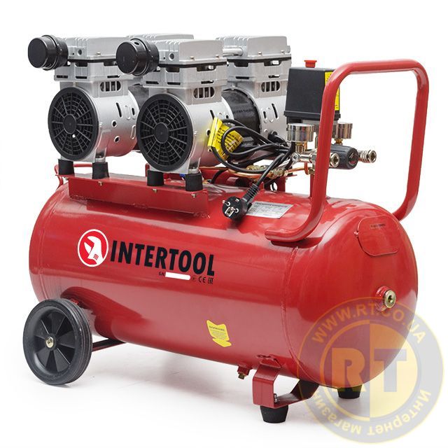 Компресор, 50 л, 2×0,75 кВт, 220 В, 8 атм, 290 л/хв, 1400 об/хв, малошумний, безмасляний, 4 циліндри INTERTOOL PT-0023